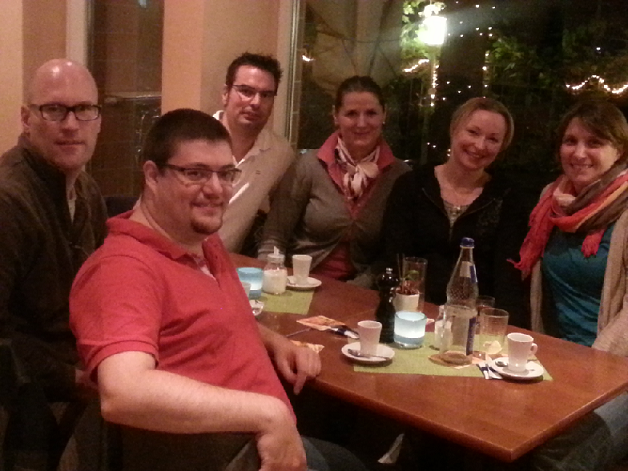 Beim Italiener in Frankfurt genießen wir mit Freunden (v.L.: Ingo, Jonas, Sascha, Fetije, Melanie und Kim) ein letztes Abendessen auf deutschem Boden.