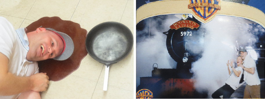 Spannend einmal hinter die Kulissen zu schauen! Welche Vorstellungskraft die Schauspieler benötigen, sieht man an den folgenden Fotos: (links) Indo in einer Plastikblutlache von einer Pfanne erschlagen und (rechts) der einfahrende Hogwarts Zug. Das Bild ist übrigens vor einer grünen Leinwand entstanden.