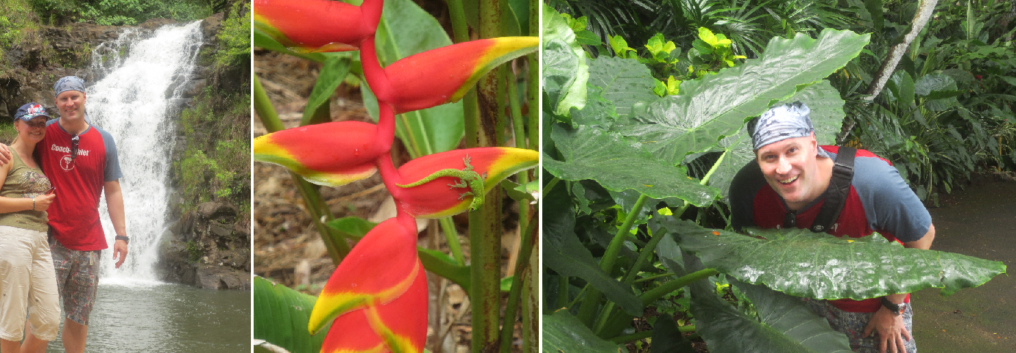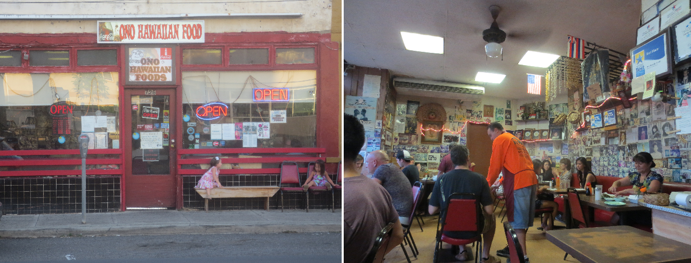 Wir essen typisch hawaiianisch in einerm völlig heruntergekommenem Lokal. Ohne Empfehlung wären wir hier wohl nicht gelandet. Das Essen schaut auch irgendwie komisch aus, schmeckt aber super. Onu, der Inhaber, erklärt uns, wie man die verschiedenen Speisen (Hula pig = in der Erde eingelegtes und geräuchertes Ferkel, Tomatensalat, Reis, Schwein in Spinat eingerollt sowie poi = dicker Brei aus tropischer Tarowurzel) zu sich nimmt. Einfach durcheinander und abwechselnd essen. Das kriegen wir so gerade noch hin. Mmmmmhhhh….lecker!