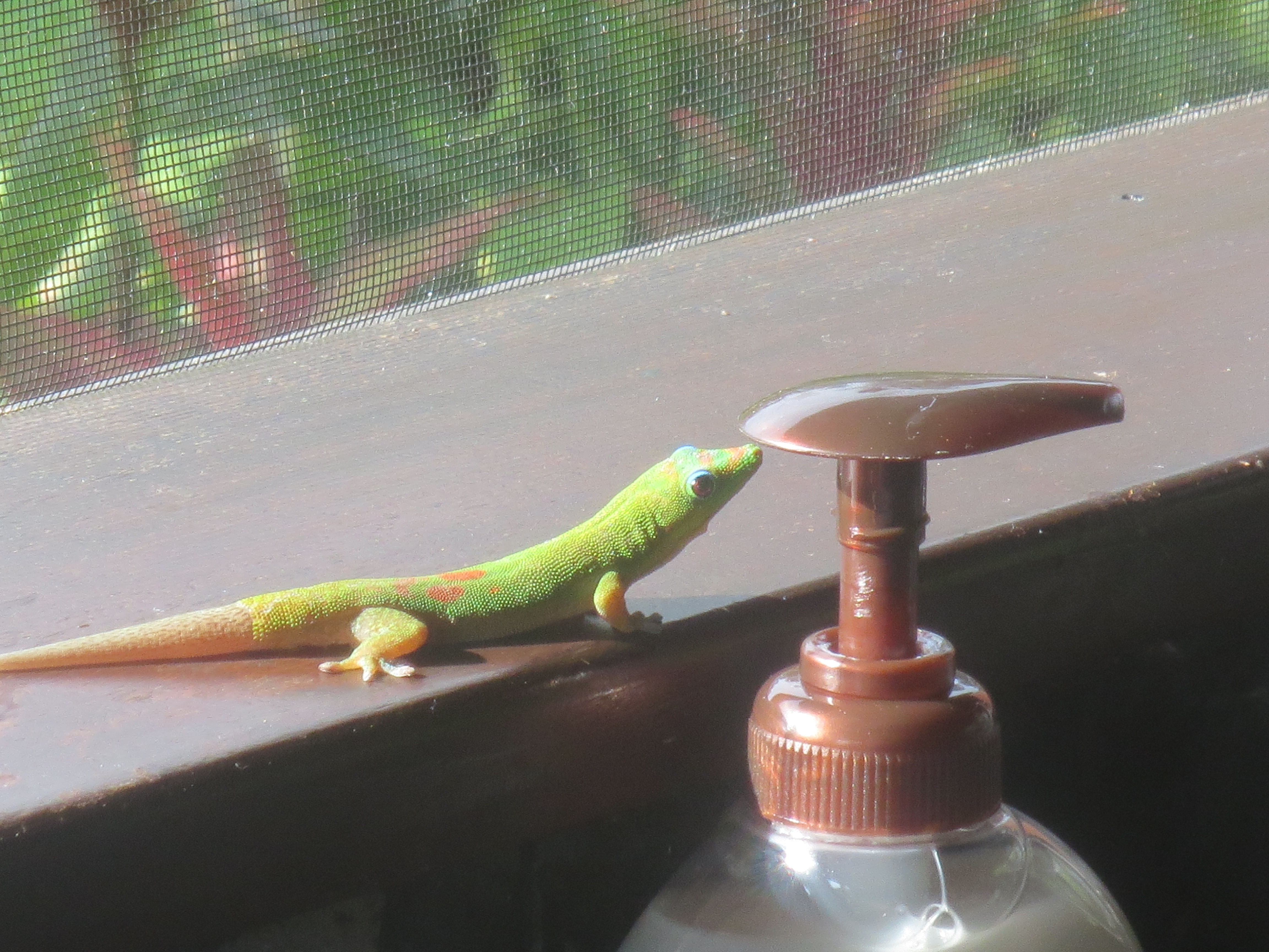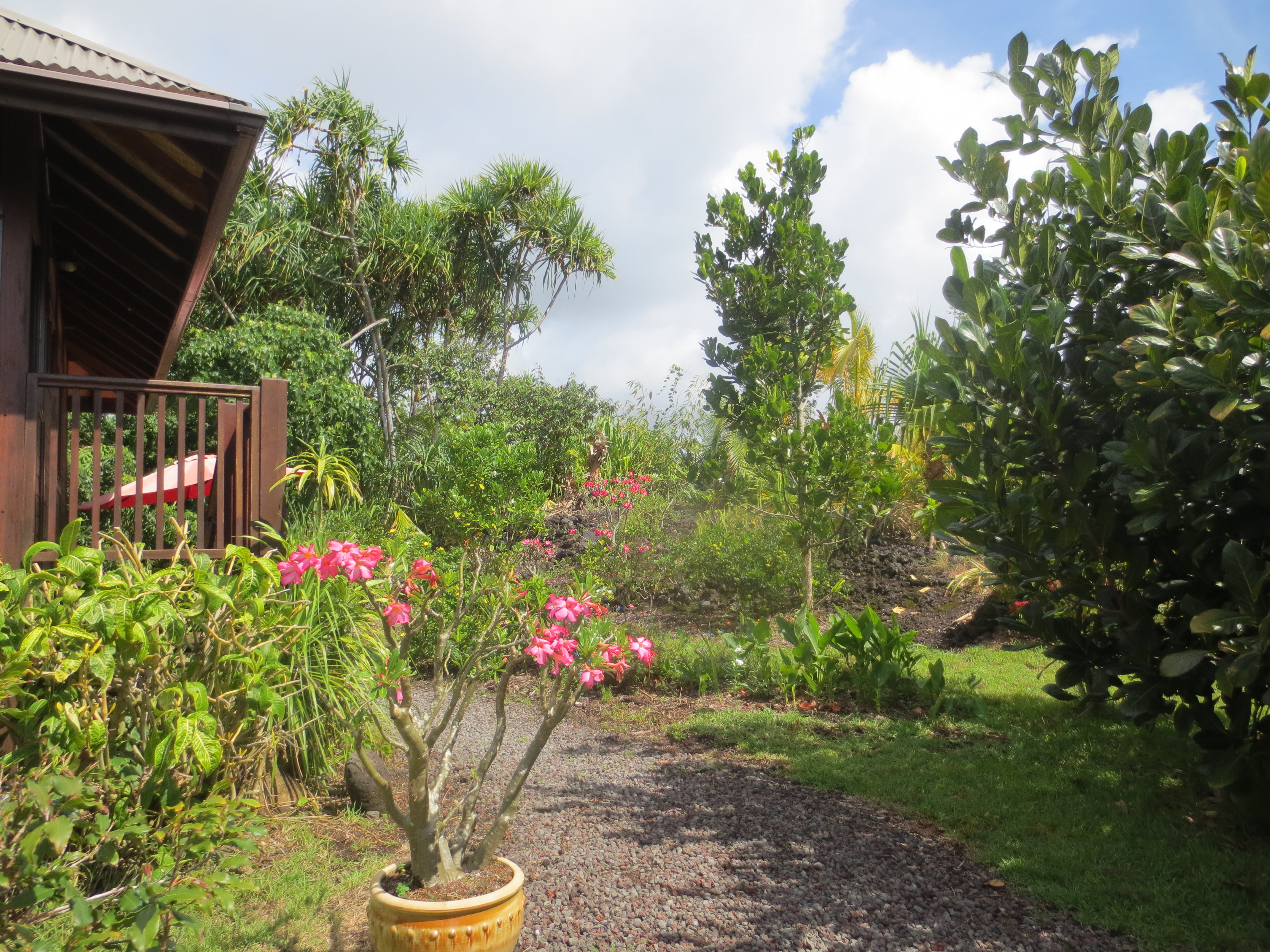 Ein schaukeliger, kleiner Flieger (mal gut das wir schon abgehärtet sind ;-)) bringt uns nach Big Island. Dies ist die jüngste und größte der Hawaii-Inseln. Der Regenwald macht seinem Namen alle Ehre und begrüßt uns mit einem heftigen Platzregen. Ab in den Jeep und dann über Berg und Tal in unser Cottage mitten im Regenwald. Wir schlafen ein beim Gezirpe der Grillen, dem Gequake der Frösche und dem Zwitschern der Vögel. Frühmorgens weckt und wärmt uns die Sonne. Der Garten ist eine Farbenpracht: Kumquat (kennen wir sonst nur aus Lukis Cocktails), Avocados, Orangen, Birnen, Mandarinen, Orchideen, Bougainvillen, Palmen, Farne, … Unsere neuen Hausbewohner (drei kleine bunte Eidechsen – wir haben sie mal Tick, Trick und Track genannt) gucken aberwitzig und neugirieg auf unser Frühstück und bei der Open-Air-Dusche streunt eine Katze vorbei. Paradiesisch!
