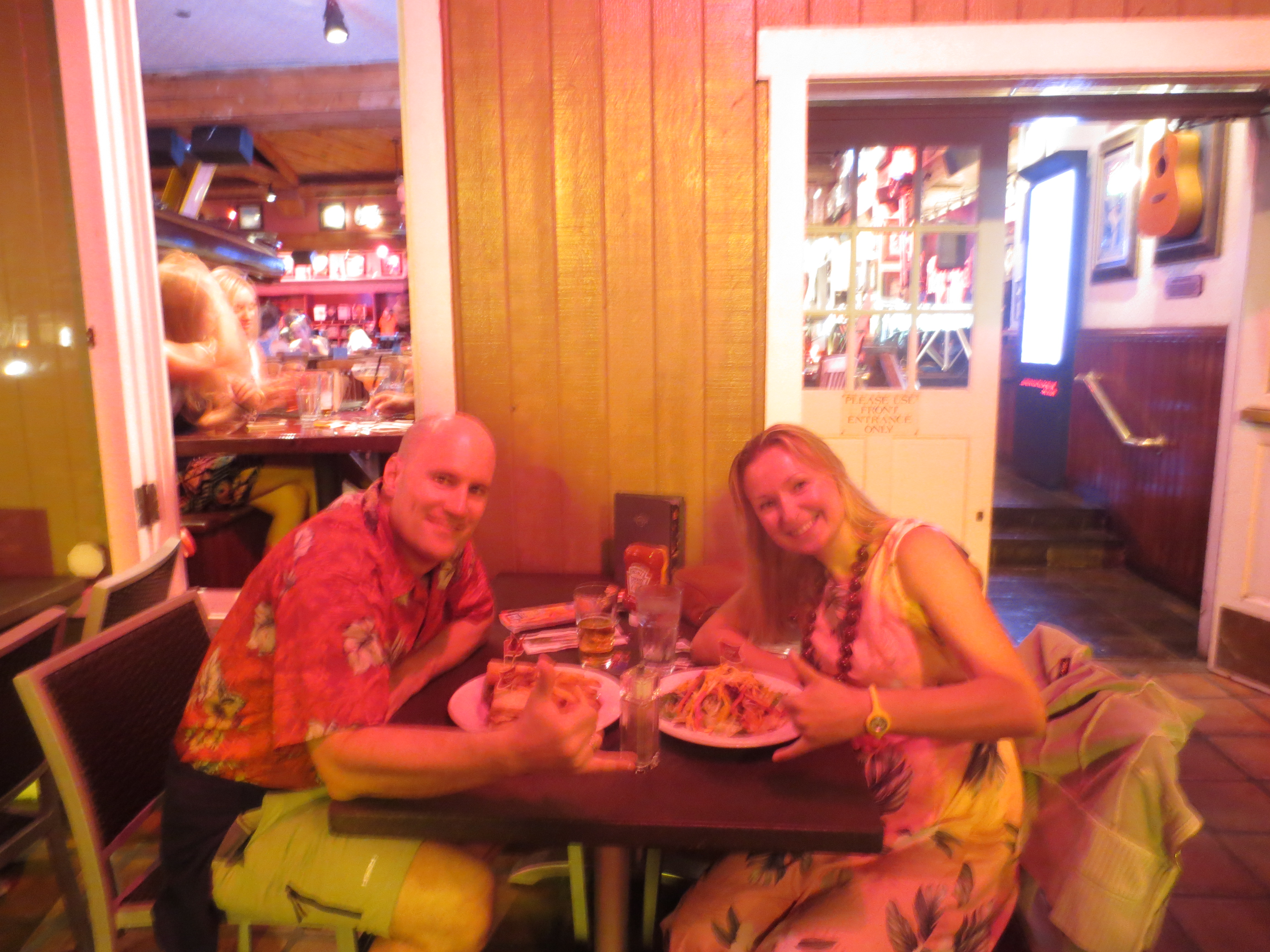 Am Abend geht es wieder nach Lahaina. Da so ein Strandtag hungrig macht, wird erstmal lecker gegessen und diesmal kriegt ihr auch ein Foto davon mit dem Maui ‚hang loose‘-Zeichen. Kleiner Tipp: Solltet ihr im Ausland beim Hard Rock Cafe einkehren, zückt ruhig mal die ADAC-Karte und teilt mit, dass Ihr damit auch Mitglied des AAA seid. Bei uns gab es 10%. Da schmeckt es gleich noch besser;-)