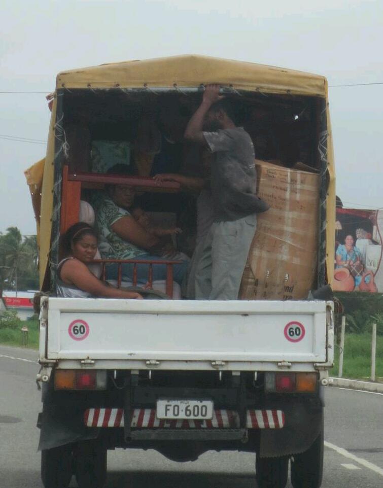 Die Haupstadt Suva erkunden wir auf eigene Faust mit einem Mietwagen. Gar nicht so einfach sich hier zurecht zu finden, denn mit Schildern ist die Insel sehr rar bestückt. Liegt vielleicht auch daran, dass die meisten Turis sich fahren lassen und die Einheimischen kennen natürlich den Weg. So haben wir jedenfalls in unserem eigenen Tempo Gelegenheit, die Insel auf uns wirken zu lassen. Wir fahren vorbei an witzigen Obst- und Gemüseständen (natürlich selbst gepflückt), windschiefen oder bunten Häusern und interessanten Mitfahrgelegenheiten.