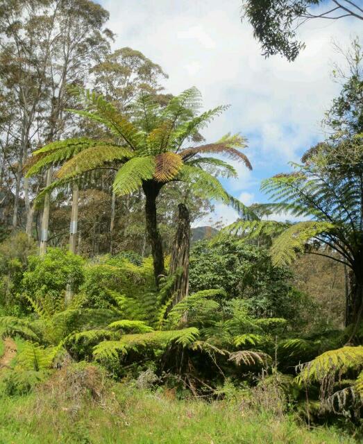Über Schotterpisten durchqueren wir den Wald. In Neuseeland gibt es 140 Farnarten, wie sich auch in dem Wappen (schwarzer Grund mit weißem Farnblatt) zeigt. Viele davon sind auf unserem Weg. Sie sind gigantisch groß, teilweise bis zu 80 Meter hoch.