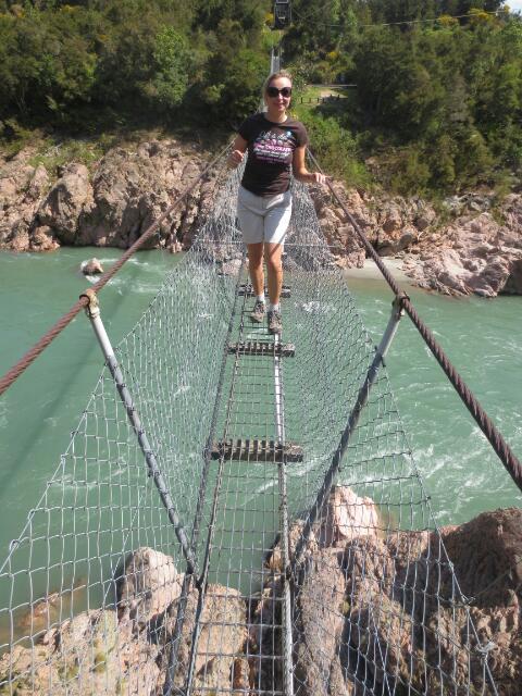 Am beeindruckendsten ist der grüne Fluß, der uns begleitet. Buller Gorge heißt er. Um ihm ganz nah zu sein, wollen wir ihn auf der größten Hängebrücke Neuseelands überqueren. Cool!