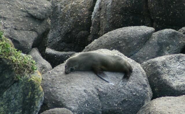 Auf unserem Weg passieren wir auch eine Seehundkolonie. Voller Enthusiasmus laufen wir los und denken schon beim Austeigen: Komisch, man riecht ja gar nix. In Kalifornien haben wir mehrere Hundert beobachtet und das roch ganz übel. … Am Aussichtspunkt angelangt, schauen wir enttäuscht auf die vor uns liegenden Steine. Damit der Weg nicht ganz umsonst war, laufen wir noch ein wenig in Richtung eines Leuchtturms. Auf dem Rückweg passieren wir erneut den Aussichtspunkt der Seehunde und finden tatsächlich noch drei Exemplare! Also doch 🙂