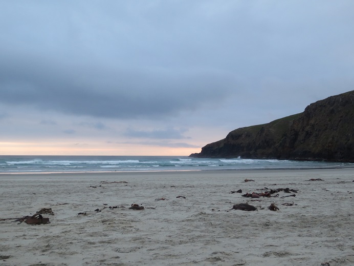 Der Sandfly Beach (wir sind wirklich froh, dass der Name des Strandes auf den fliegenden Sand zurückzuführen ist und nix mit den unangenehmen, stechenden Sandfliegen zu tun hat) bietet Puderzuckerstrand. Beschwingt laufen wir dem Meer entgegen und werden jäh von einer Tierschützerin gebremst. Das ist auch gut so, denn zu einbrechender Dämmerung kommen die seltenen Gelb-Augen-Pinguine an den Strand zurück. Die possierlichen Kerle sind sehr scheu, daher ducken wir uns und warten gebannt darauf, dass die Vögel an Land watscheln. Weiter unten am Strand liegt ein Seelöwe, dem wir uns bis auf 10 Meter nähern dürfen.