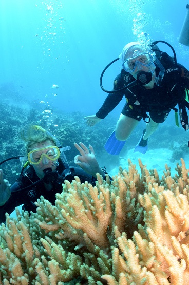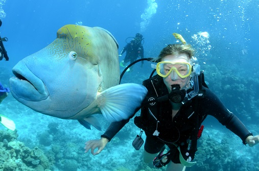 Die Reef Experience bringt uns und ca. 80 weitere Touris zu dem Riff schlechthin. Das Great Barrier Reef wurde 1981 zum Welkulturerbe erklärt, erstreckt sich über 2.300 Kilometer und umfaßt ca. 2.900 Einzelriffe. Wir steuern zuerst das Norman Reef am äußeren Rand des Riffs an. Um das Ausmaß erkennen zu können, probieren wir es mit einem Tauchgang, denn nun sind wir ja zertifizerte Taucher. Das Riff ist allerdings so flach und die Sichtweite des kristallklaren, blauen Wassers beträgt ca. 15 Meter, dass man als Taucher nahezu genauso gut sieht wie als Schnorchler (nach dem Tauchgang gehen wir schnorcheln und haben daher den direkten Vergleich). Irre beim Tauchen ist jedoch, wie nahe man den Tieren unter Wasser kommen kann, besonders dem großen Lippfisch.