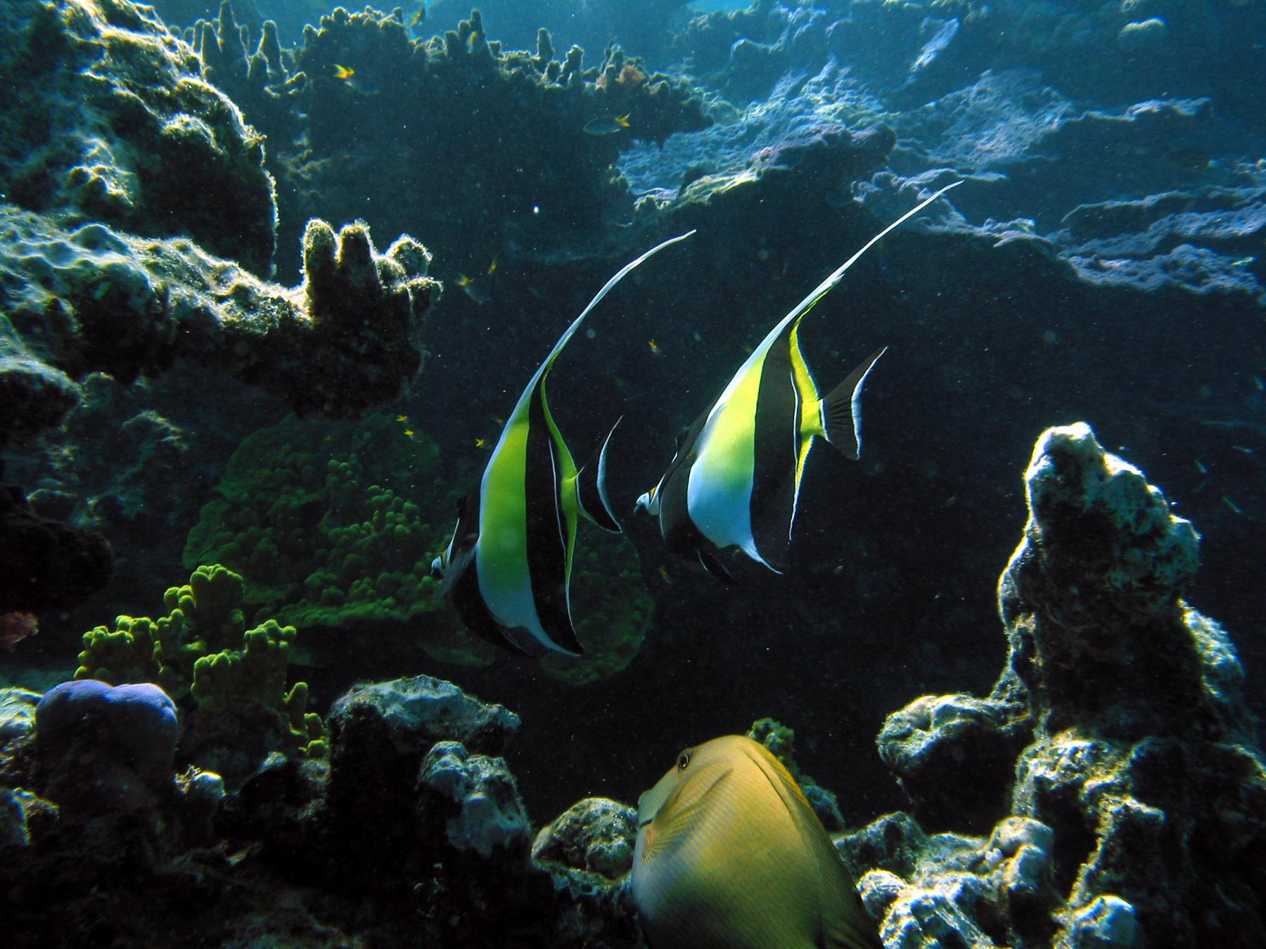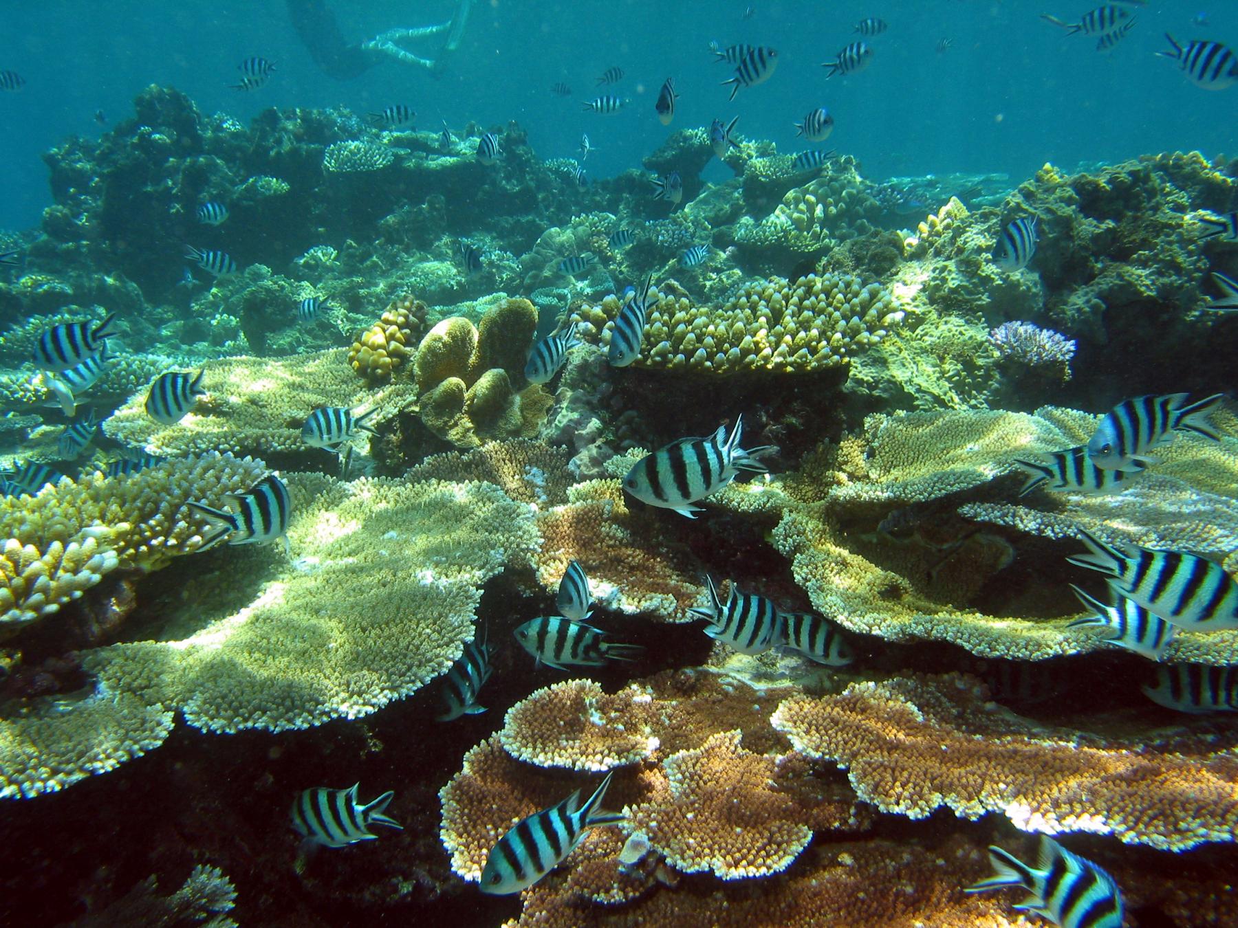 Nach entspannter Mittagspause und vollem Magen steuern wir auf dem Kathamaran auf das Hastings Reef zu. Maske auf und ab zum Schnorcheln. Das Riff ist richtig schön und intakt, d.h. viele bunte Korallen, Seesterne und riesiege Muscheln. Generell scheint hier einiges größer zu sein, denn einige Fischarten, wovon es hier 400 verschiedene gobt, haben wir zuvor schon einmal ungefähr halb so groß gesehen. Echt riesig!
