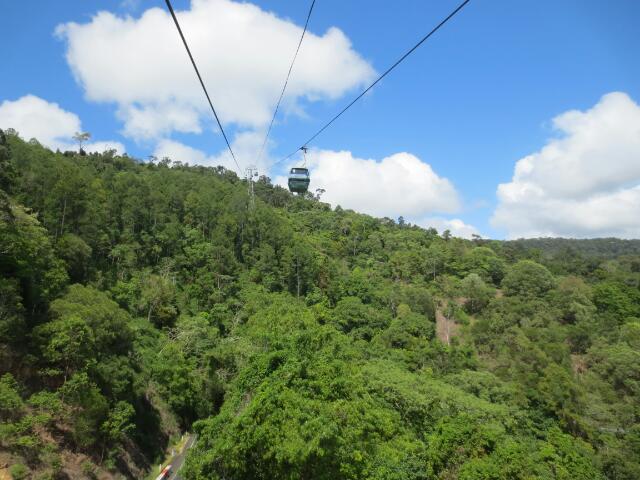 Nachdem wir die nähere Umgebung bereits unter Wasser erkundet haben, steht heute die Über-Wasser-Erkundung auf dem Programm. Der Regenwald Australiens ist mit über 200 Millionen Jahren der Älteste der Welt. Von Cairns aus nehmen wir die 7,5 Kilometer lange Seilbahn, die direkt durch den Regenwald verläuft. Die Gondeln schweben direkt über den Baumwipfeln des Regenwaldes und schaukeln uns in das kleine Örtchen Kuranda.