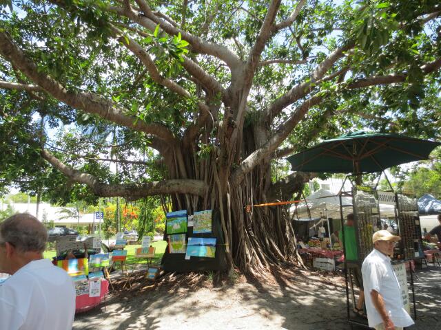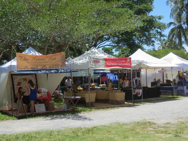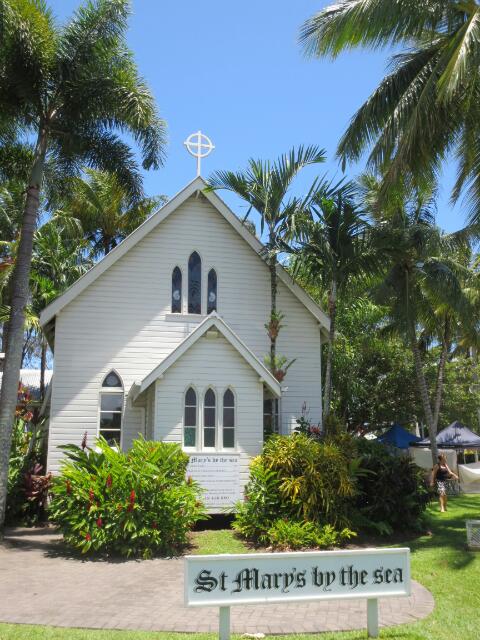 Diesmal rufen wir wieder bei George an, mit dem wir verabreden, dass im nächsten Ort ein Servicemensch vorbeikommt. So verbringen wir in Port Douglas ein paar schöne Stunden mit Café und Karottenkuchen. Der Mechaniker kontrolliert die Bremsen und teilt uns mit, dass diese noch völlig intakt sind und anscheinend nur ein Problem mit der Anzeige vorliegt. Gut, ist uns auch lieber. Da wir nun aber sehr viel Zeit verloren haben, planen wir eine Nacht im Regenwald ein. Wir verlassen den Ort Port Douglas, nachdem wir noch einmal zur klassischen Hochzeitskirche und über den Markt dort geschlendert sind. Der Markt ist nur sonntags geöffnet und es werden individuell gefertigte Waren aus Stoff, Holz und Früchten angeboten. Ingo erwirbt eine Tasche und Mel ist froh nun nicht mehr alles in ihrer Tasche schleppen zu müssen.
