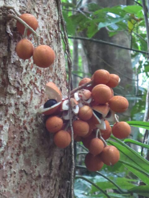 Wir brechen auf zum knapp 3 Kilometer langen Jindalba Walk. Dieser führt uns mitten durch den Regenwald, über Baumwurzeln und Wasserläufe s. 2. Reihe rechts). Da uns Niemand entgegekommt, sind wir alleine mit der Natur und hoffen auf interessante Entdeckungen. Der Regenwald beheimatet 60% aller Schmetterlingsarten Australiens, von denen wir einige tolle Exemplare, besonders den Ulyssus (ca. 5 cm große und leuchtendblau), bestaunen können. 23% aller Reptilienarten Australiens sind auch hier vertreten, aber leider sehen wir nur ein paar scheue Eidechsen. Wir lauschen dem unentwegten Gezwitscher der Vögel, deren Artenreichtum sich hier auf 50% erstreckt, d.h. 370 verschiedene Arten. Zusammen mit dem Gezwitscher der Vögel und dem Gezirpe hunderter Grillen ertönt eine irre Geräuschkulisse! Einige der beeindruckenden Bäume tragen farbenfrohe Früchte.