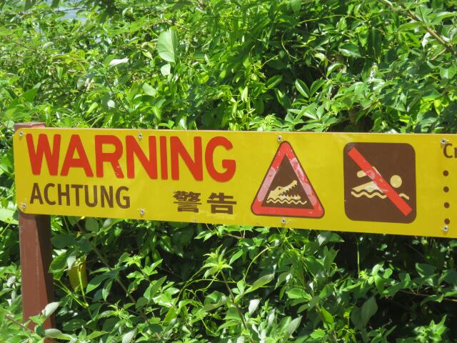 Der nördlichste mit dem Camper befahrbare Ort, Cape Tribulation, bietet eine schöne Aussicht auf die Strände. Wie nahezu überall in Croc Valley, wird man auch hier freundlich vor den Urzeitechsen gewarnt.