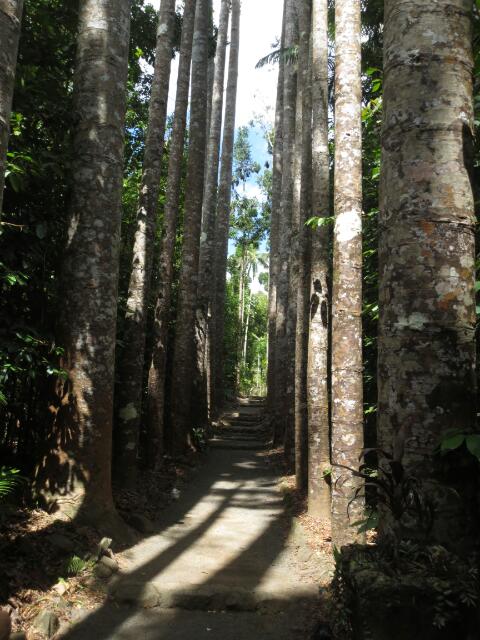 Unser Tag beginnt wie der Abend endet, mit einer Besichtigung des Paronella Parks. Heute erfahren wir viel über die Entstehung und die Hintergründe. Im begrünten Park, der für die Besitzerin angelegt wurde, wachsen bunte Blumen, riesige Bambusstengel, jede Menge Palmen und überall Moos. Aus der Kaori Pinie ist sogar ein ganzer Weg geformt. In einer Höhle sehen wir hunderte kleiner Fledermäuse, deren Bestand stetig wächst, denn der Bauer nebenan züchtet Hühner und diese scheinen den Pythons besser zu schmecken als die Fledermäuse. Gut für die kleinen Nachtschwärmer.