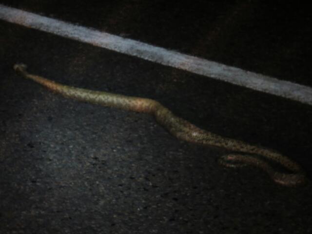 Spät Nachmittags fahren wir  weiter. Unser Wagen scheint heile. Wir haben uns entschieden, dass die Abendfahrt angenehmer ist, da weniger Straßenbauarbeiten anzutreffen sind (man glaubt es kaum, aber davon gibt es hier jede Menge) und es nicht so heiß ist. Abends um 20h fahren wir fast allein über die Straße. Beinahe hätten wir eine Python überrollt. Als wir den Hinweis, abends wegen der Pythons bitte langsam zu fahren, gesehen haben, haben wir dies noch für Unsinn gehalten. Hier der Beweis!
