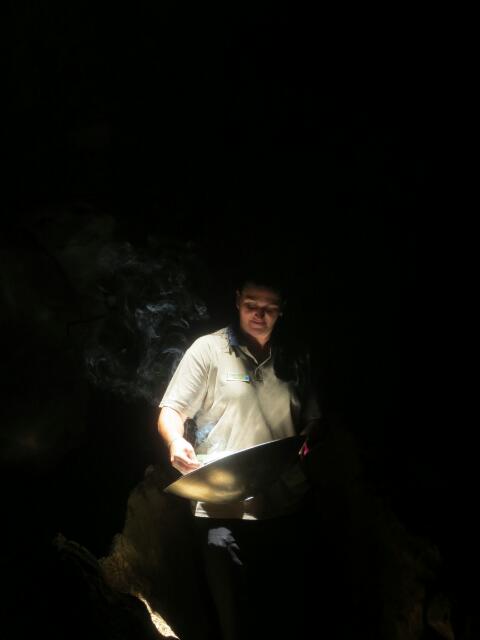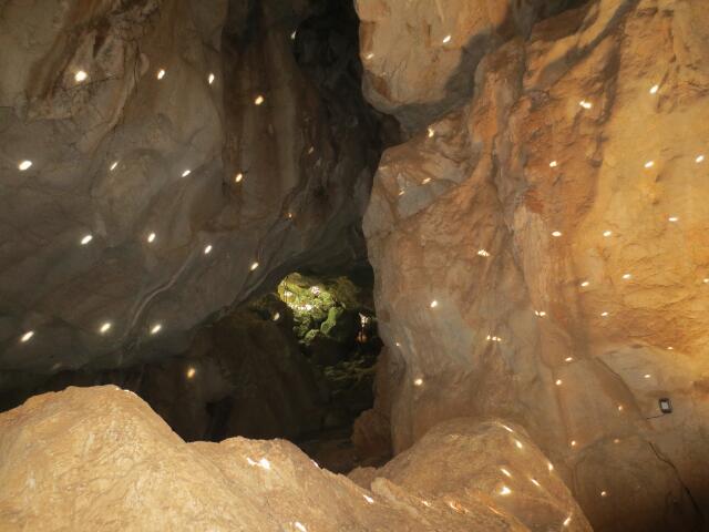 Wie passend, zur Zeit des Steinbocks besichtigen wir die Steinbock-Höhlen und zwar genau zur richtigen Zeit, denn der Einfall des Lichts aus 14 Metern Höhe kann für verschiedene Dinge genutzt werden: Diskofeeling (mit einer Diskokugel werden Lichter an die Höhlenwände gezaubert), Farbenspiele (unterschiedlich farbige Tücher färben die Höhlenwände bunt) und Verbrennung (mit einer Spiegelfläche wird ein Loch in unsere Eintrittskarte gebrannt).