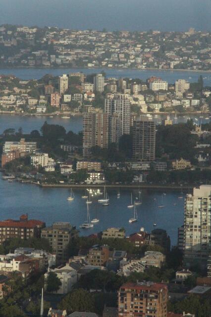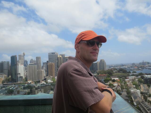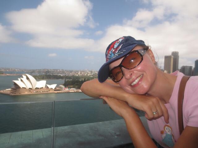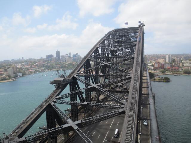 Das andere bekannte Wahrzeichen ist die Harbour-Bridge. Seit 1932 umspannt sie mit elegantem Schwung den 503 Meter breiten Hafen. Und wie lässt sie sich am besten betrachten? Na klar, von oben! Mel probiert den legendären Brückenlauf. Hierbei werden die Hälfte der Gesamtlänge von 1.149 Meter nach vorne und 220 Stufen nach oben bestiegen, um die 134 Meter zu erklimmen. Steil geht es hinab, aber mit Drahtseil befestigt, kann ja nichts passieren. Auf dem Brückenbild sind die Läufer erkennbar. Von oben hat man einen gigantischen Blick. Einen ähnlichen Blick bekommt man von einem der Brückentürme, dem Pylon Lookout, geboten. Die vier tragenden, 89 Meter hohen Betonpfeiler sind mit Granit aus den Steingruben der Moruya-Berge umgeben. Dem Granit sagt man heilende Wirkung nach. Naja, wer’s glaubt – gegen Kopfweh hilft Aspirin jedenfalls besser 😮