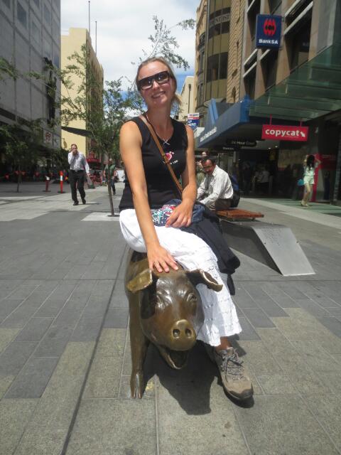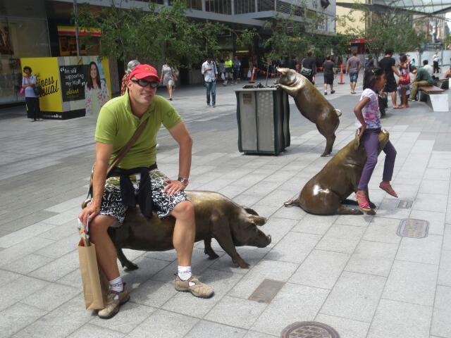 Es gibt auch hier wieder riesige Shoppingcentren, in denen man sich echt verlaufen kann. Zum Glück gefällt uns der Stil nicht, so dass unser Gepäck wenigstens nicht durch Klamotten schwerer wird;-) Was uns jedoch gut gefällt, sind die Statuen der Stadt. Die vier Bronze-Schweine wurden durch eine Umfrage bei der Bevölkerung auf die Namen Truffel (mit Mel), Oliver, Horatio, Augusta (mit Ingo) getauft.