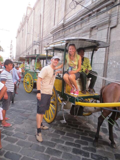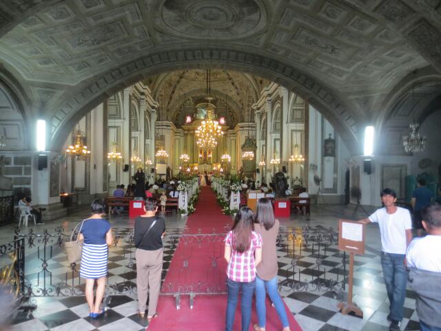 Wir erfahren auf spielerische Art und Weise den Ablauf der historischen Vergangenheit, den wir uns im Ayala-Museum bereits anlesen konnten. 1565 wurden die ersten spanischen Häuser errichtet und die Ära des spanischen Kolonialreiches begann. Durch die spanische Herrschaft sind viele Kirchen entstanden und es gibt hier die größte christliche Bevölkerung. Einige der barocken Kirchen stehen noch heute. Mit einer Pferdekutsche gelangen wir zur Kirche St. Augustin, in der gerade eine Hochzeit stattfindet.