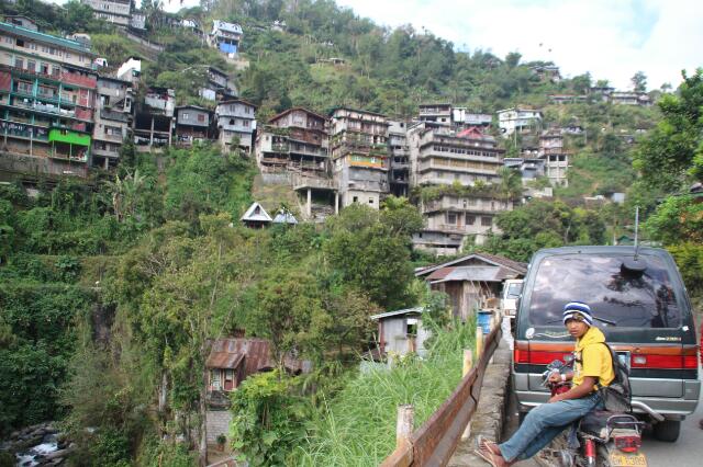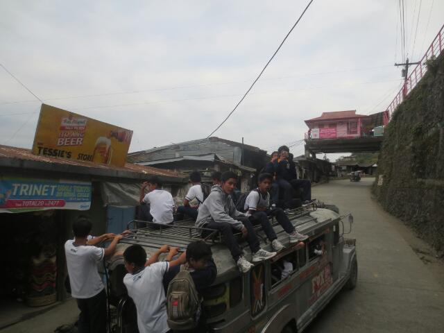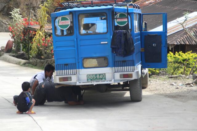 Vor dem Hotel wartet schon unser privater Jeepney (öffentlicher Bus)! Seit wir auf den Philippinen sind, bestaunen wir die tollen Fahrzeuge, die mit viel Liebe zum Detail von dem jeweiligen Besitzer leidenschaftlich hergerichtet werden. Denn anders als bei uns, sind sie Privateigentum der jeweilige Philippiner. Von einer Fahrt mit dem witzigen Gefährt hat man uns bisher immer abgeraten, da Raubüberfälle keine Seltenheit sind. Heute dürfen wir nicht nur mitfahren, sondern auch noch auf dem Dach Platz nehmen. Wahrscheinlich haben sie das nur zum Spaß gesagt, denn die Dorfbewohner schauen irritiert, winken uns freudig zu oder machen sogar Fotos als wir durch Banaue fahren. Die Aussicht von oben ist irre und wir können uns an der Landschaft und dem Gewusel um uns herum nicht satt sehen. Zwischenstopp wegen Reifenpanne. Diesmal müssen wir aber wenigstens nicht selbst Hand anlegen.