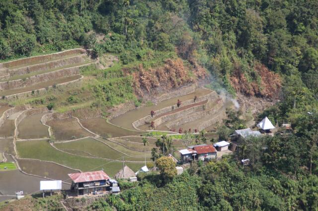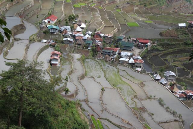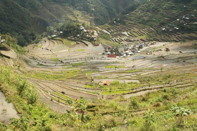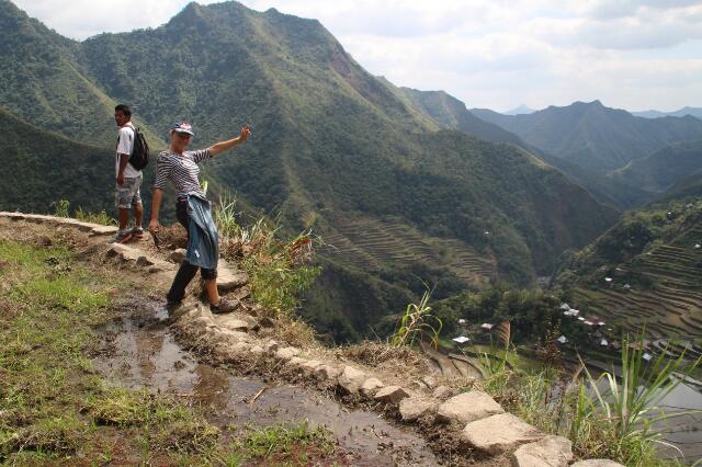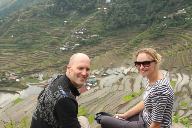 Nach der anderthalbstündigen Fahrt sind wir total durchgerüttelt und -pustet. Mit unserem Tourguide wollen wir die Reisfelder von Batad erkunden. Da wir fit sind, dürfen wir die große Runde gehen. Erst bergab und dann steil wieder bergauf, kraxeln wir zum oberen Rand der Reisfelder. Wir balancieren um die einzelnen Reisfelder herum, immer mit Blick auf die Füße, denn ein falscher Tritt befördert uns in das ca. 2-3 m unter uns gelegene, schlammige Feld. Vor uns eröffnet sich ein gigantischer Ausblick über die wie ein Amphitheater angelgegten Reisterassen. Irre!