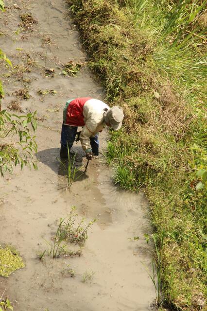 Der Reis wird organisch angebaut, d.h. ohne chemische Mittel. Arg zu kämpfen haben die Besitzer mit Schnecken, die sich auf den Halmen einnisten (pinkfarbene Eier) und die Gräser beschädigen. Hier hilft nur ein Entfernen per Hand oder die gesamte Terasse auszutrocknen. Es ist aber nicht auszuschließen, dass die Plagegeister wiederkehren. Gegen die Vögel werden Plastiktüten auf Pfähle gebunden und in die Terassen gesteckt. Für die Bepflanzung und Ernte gibt es vier Zeiträume: Oktober bis Janurar wird gesäubert bzw. natürlich gedüngt, Februar bis März wird gesetzt, April bis Mai wächst der Reis und im Juni bis August wird geerntet. Danach fängt die Regenzeit an, in der durchaus Taifune über die Felder wehen. Bis dahin sollte die Ernte eingeholt sein. Die Feldarbeit überlassen die Männer übrigens ihren Frauen, daher haben die Frauen hier auch einen sehr hohen Stellenwert. Für eine ’normale‘ Frau muss der Mann zur Verlobung 2 Schweine besorgen und bei der Hochzeit ca. 15 Stück. Eine Frau mit Reisfeld ist bis zu 25 Schweine wert. Sollte sie allerdings auf die Idee kommen sich scheiden zu lassen, muss sie dem Mann ebendiese Anzahl an Schweinen zurückgeben, der sich dann davon eine neue Frau kaufen kann. Tja, das läuft ein wenig anders als in Deutschland. Da haben wir ja noch mal Schwein gehabt 😮