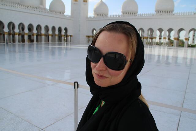 Das Highlight kommt wie immer zum Schluß: die große Moschee des Scheich Zayed. Vier Minarett-Türme schmücken den Platz. Wir erfahren von unserem Guide Mohammed (wie könnte er auch anders heißen ;-)), dass die Größe der Moschee die Anzahl der Minarette bestimmt. Die Moschee hat 82 Dome (Kuppeln) im Inneren und noch mal 28 Weitere im Außenbereich. Sie ist aus weißem, italienischem Mamor gefertigt. Bevor wir die Moschee betreten, muss Mel sich verhüllen. Schaut schon nett aus! Als wir unseren Guide nach der Verhüllung befragen teilt er uns mit, dass dies zum Schutz geschieht, denn der Mann möchte die Schönheit seines weiblichen Juwels vor neidischen Blicken schützen. Aber warum tragen Männer eigentlich ein weißes und Frauen ein schwarzes Gewand? Auch darauf weiß Mohammed eine Antwort: Früher war das Ernten und Sammeln von Perlen eine Haupteinnahmequelle. Hierfür mussten viele Männer oft wochenlang ihre Frauen und Kinder allein lassen. Ein paar wenige Männer hatten die Aufgabe inne, über die Frauen zu wachen. Sofern Gefahr drohte, konnten die Frauen mit ihren schwarzen Gewändern in der Dunkelheit leichter flüchten und die Männer mit ihren weißen Gewändern die Aufmerksamkeit auf sich ziehen.