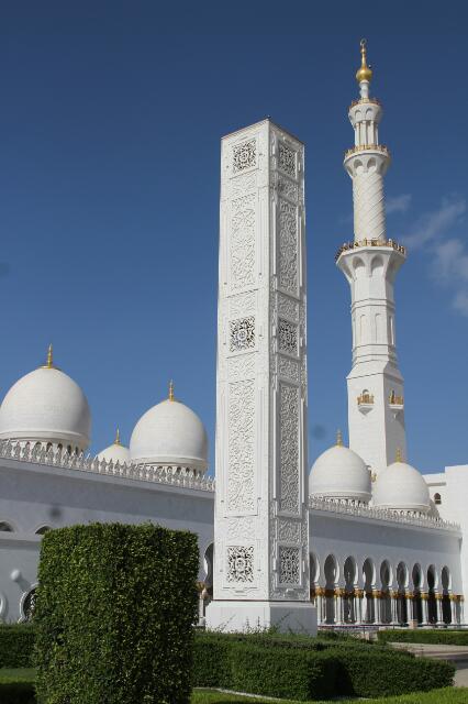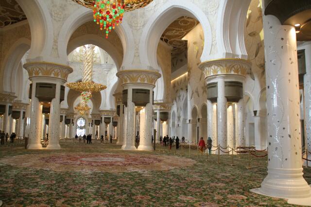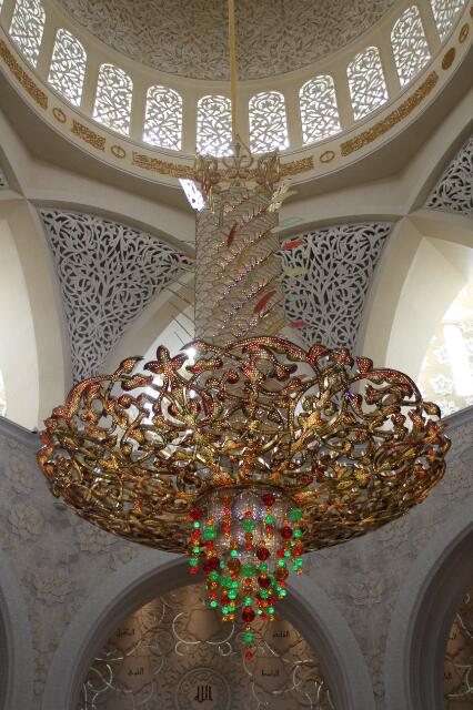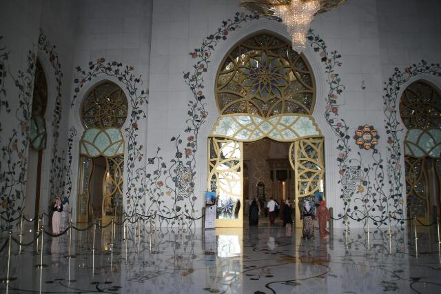 Die Böden der Moschee sind mit Blumeneinlegearbeiten gefertigt. Im südlichen Teil die Blumen der südlichen Hemisphäre und im nördlichen Teil die der nördlichen Hemispähre. Es gibt fünf verschiedene Kronleuchter. Der Schwerste wiegt 12 Tonnen und wird mit einer innenliegenden Leiter gereinigt. Er ist umgeben von mehr als einer Million Swarowski-Christallen. Die Wand in Richtung Mekka ist mit einer gold-weißen Nische versehen, umgeben von 99 Sternen die alle Namen für Gott bzw. Allah beinhalten. Da es aber zig weitere Namen gibt, ist ein Stern für 1 bis n-Namen offen geblieben. Eine schöne Idee!